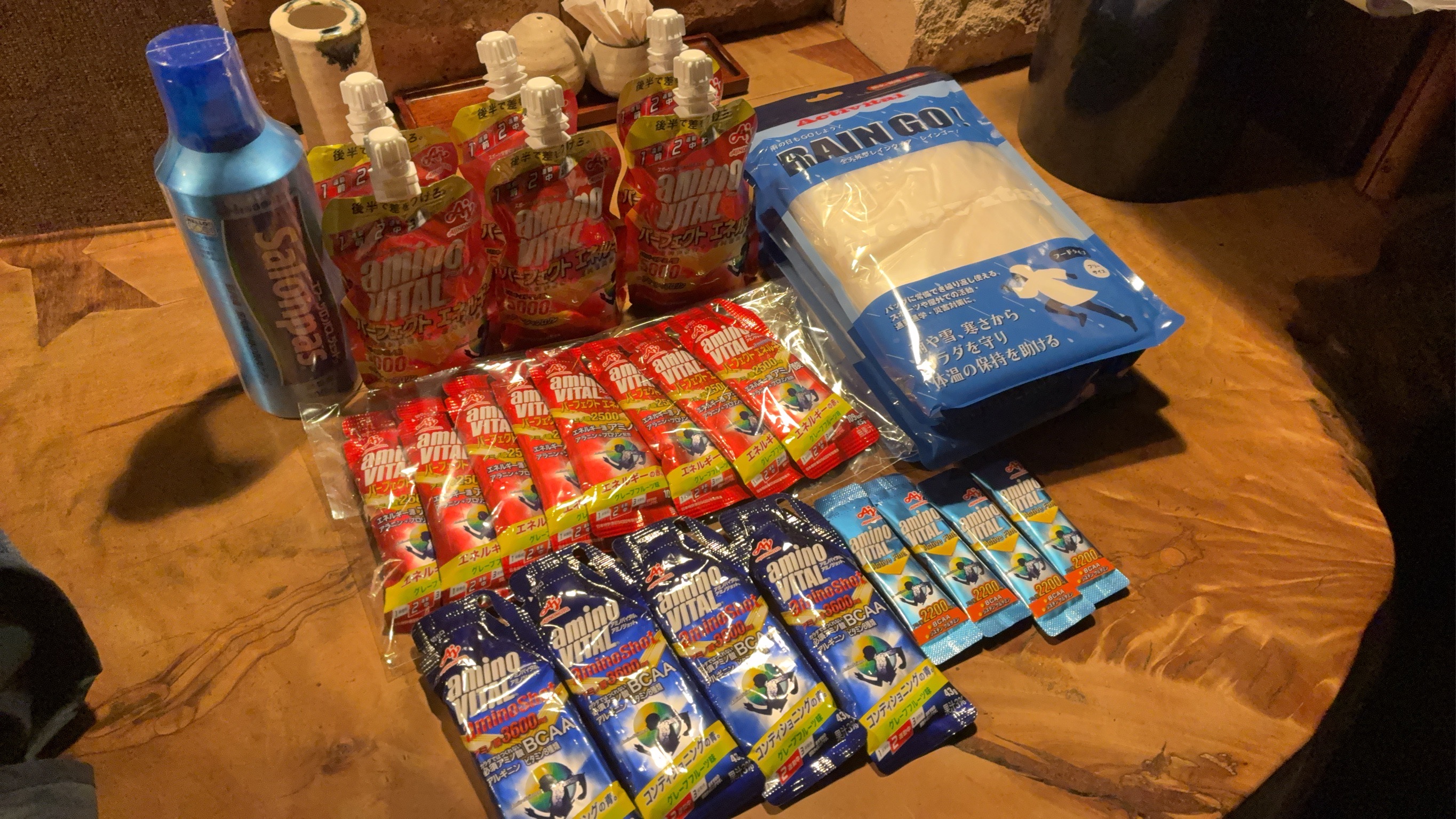 走ってる最中に飲むアミノバイタル、エアーサロンパス、雨の日用ランニング用カッパ。