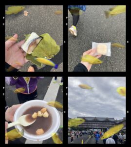 脚の終わりを実感しだした私はそういった食べ物を心の拠り所に、同じように苦しみだした大東さんと互いを支え合いながら歩を進めていると、『あともうちょっとでぜんざいやでー!』先に折り返してきたランナーが後続の我々を鼓舞してくれました。ヨシ!ぜんざい!余談ですが、私、あんこがめちゃくちゃ好きです。